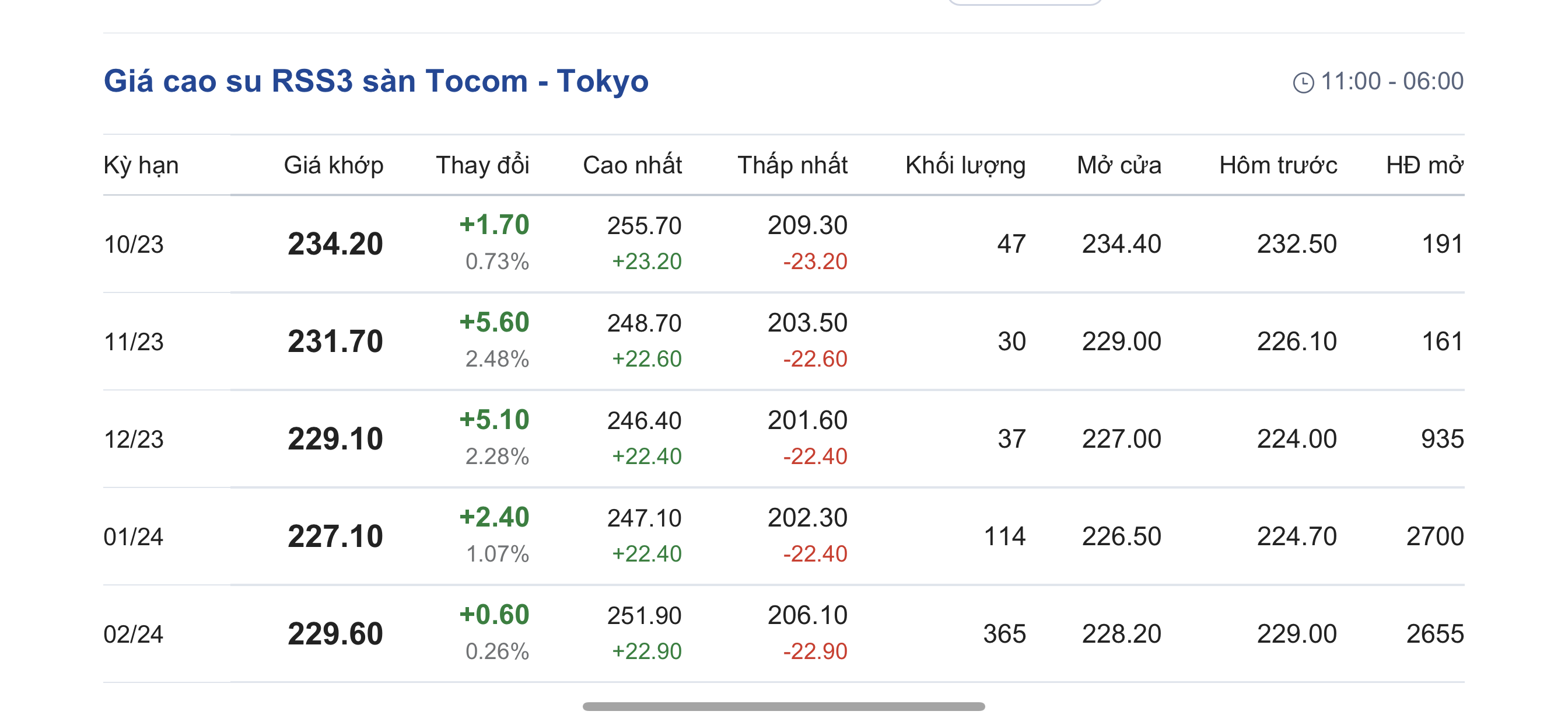 Tại Sở giao dịch hàng hóa Tokyo (TOCOM), giá cao su kỳ hạn giao tháng 10/2023 đạt mức 234,2 yen/kg, tăng 0,73% (tương đương 1,7 yen/kg) tại thời điểm khảo sát vào lúc 6h12 (giờ Việt Nam).