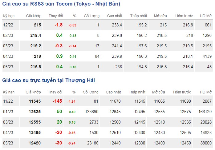 Tại Sở giao dịch hàng hóa Tokyo (TOCOM), giá cao su kỳ hạn giao tháng 12/2022 đạt mức 215 yen/kg, giảm 0,83% (tương đương 1,8 yen/kg) tại thời điểm khảo sát vào lúc 7h15 (giờ Việt Nam).