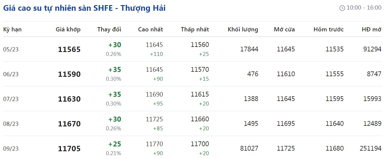 Trên Sàn giao dịch hàng hóa tương lai Thượng Hải (SHFE), giá cao su RSS3 giao kỳ hạn tháng 5/2023 được điều chỉnh lên mức 11.565 nhân dân tệ/tấn, tăng 0,26% (tương đương 30 nhân dân tệ) so với giao dịch trước đó.