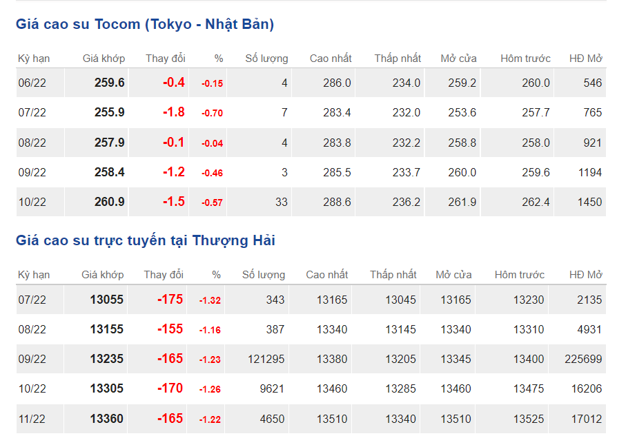 Ngày 30/5/2022, giá cao su RSS3 giao tháng 6/2022 giao dịch ở mức 249,2 yen/ kg (tương đương 1,96 USD/kg), tăng 1,7% so với cuối tháng 4/2022 và tăng 0,5% so với cùng kỳ năm 2021. Giá cao su tại Nhật Bản tăng do số liệu dịch vụ doanh nghiệp trong nước làm dấy lên mối lo ngại về lạm phát và triển vọng nhu cầu trong tương lai.