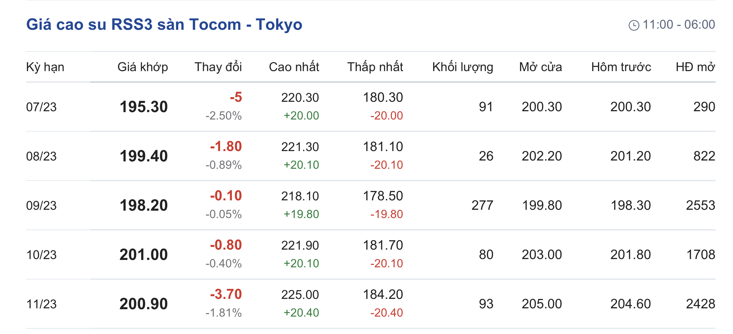 Tại Sở giao dịch hàng hóa Tokyo (TOCOM), giá cao su kỳ hạn giao tháng 7/2023 đạt mức 195,3 yen/kg, giảm 2,5% (tương đương 5 yen/kg) tại thời điểm khảo sát vào lúc 7h00 (giờ Việt Nam).