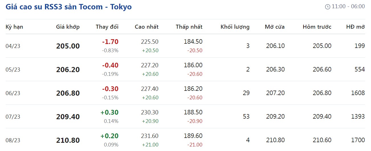 Tại Sở giao dịch hàng hóa Tokyo (TOCOM), giá cao su kỳ hạn giao tháng 4/2023 đạt mức 205 yen/kg, giảm 0,83% (tương đương 1,7 yen/kg) tại thời điểm khảo sát vào lúc 7h35 (giờ Việt Nam).