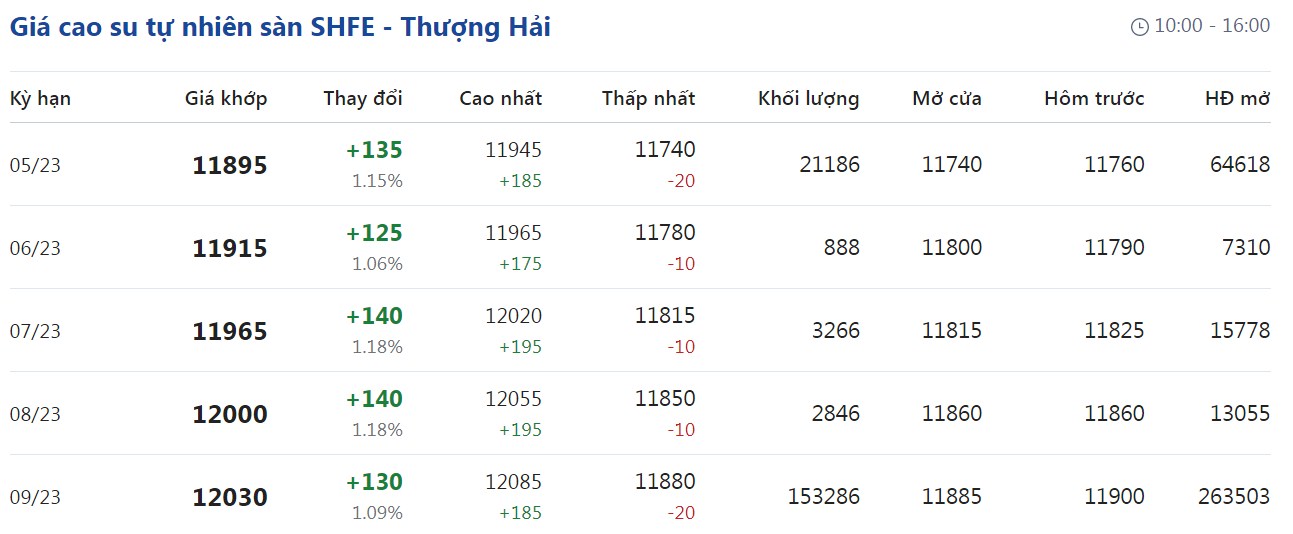 Trên Sàn giao dịch hàng hóa tương lai Thượng Hải (SHFE), giá cao su RSS3 giao kỳ hạn tháng 5/2023 được điều chỉnh lên mức 11.895 nhân dân tệ/tấn, tăng 1,15% (tương đương 135 nhân dân tệ) so với giao dịch trước đó.
