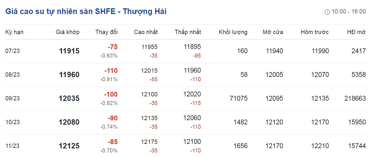 Trên Sàn giao dịch hàng hóa tương lai Thượng Hải (SHFE), giá cao su RSS3 giao kỳ hạn tháng 6/2023 được điều chỉnh xuống mức 11.915 nhân dân tệ/tấn, giảm 0,63% (tương đương 75 nhân dân tệ) so với giao dịch trước đó.