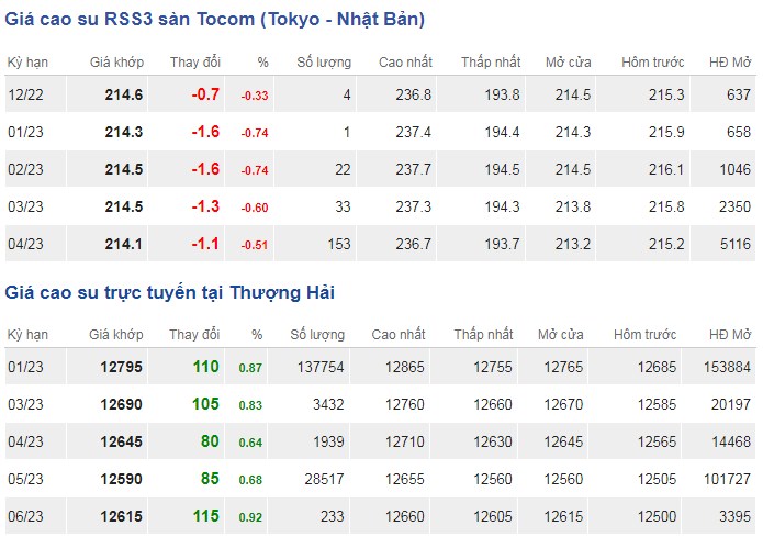 Tại Sở giao dịch hàng hóa Tokyo (TOCOM), giá cao su kỳ hạn giao tháng 12/2022 đạt mức 214,6 yen/kg, giảm 0,33% (tương đương 0,8 yen/kg) tại thời điểm khảo sát vào lúc 7h30 (giờ Việt Nam).
