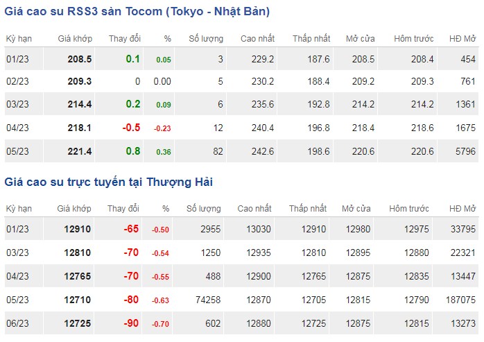 Tại Sở giao dịch hàng hóa Tokyo (TOCOM), giá cao su kỳ hạn giao tháng 1/2023 đạt mức 208,5 yen/kg, tăng 0,05% (tương đương 0,1 yen/kg) tại thời điểm khảo sát vào lúc 7h30 (giờ Việt Nam).