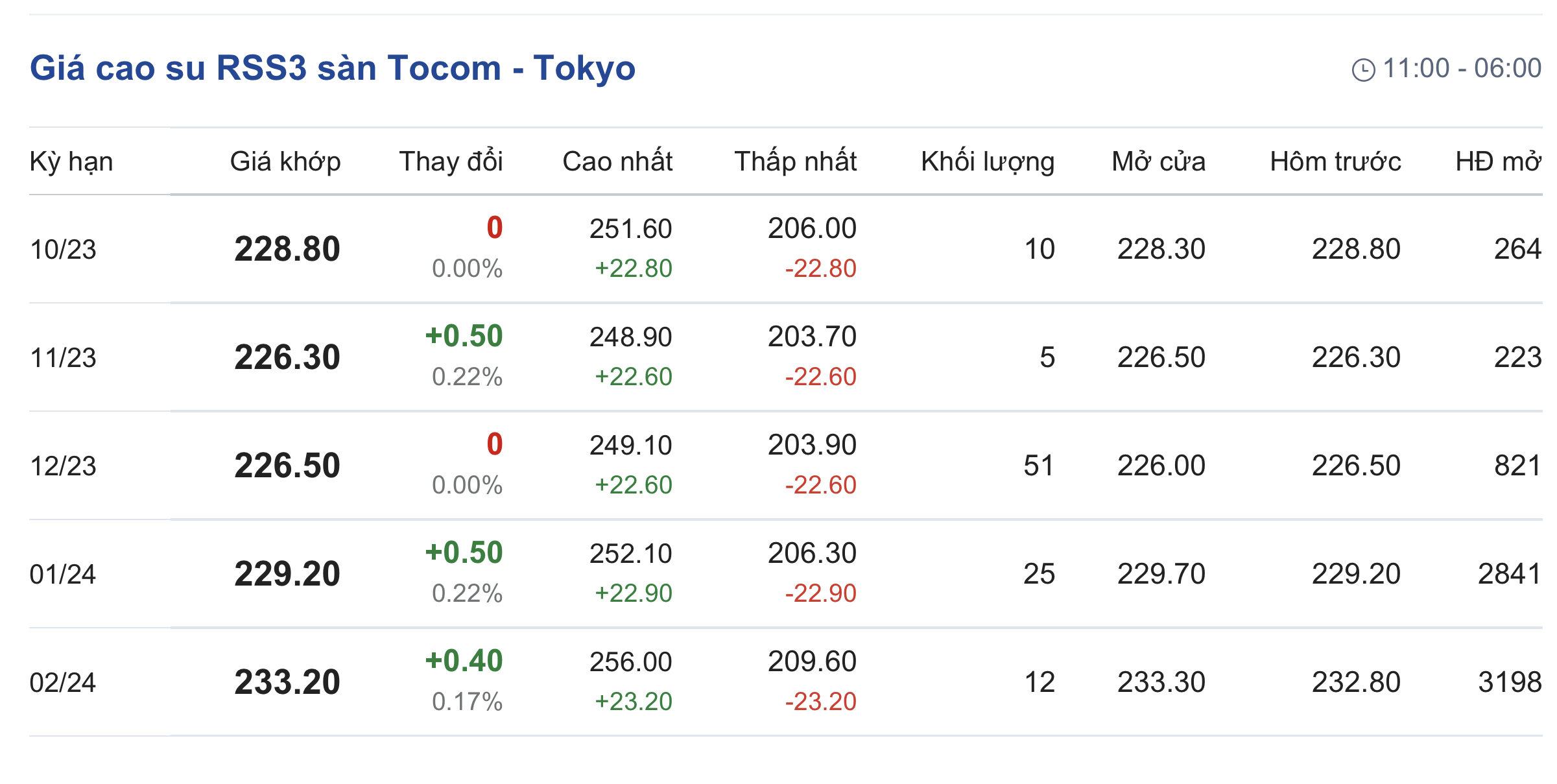 Tại Sở giao dịch hàng hóa Tokyo (TOCOM), giá cao su kỳ hạn giao tháng 10/2023 đạt mức 228,8 yen/kg, không có điều chỉnh mới tại thời điểm khảo sát vào lúc 6h18 (giờ Việt Nam).