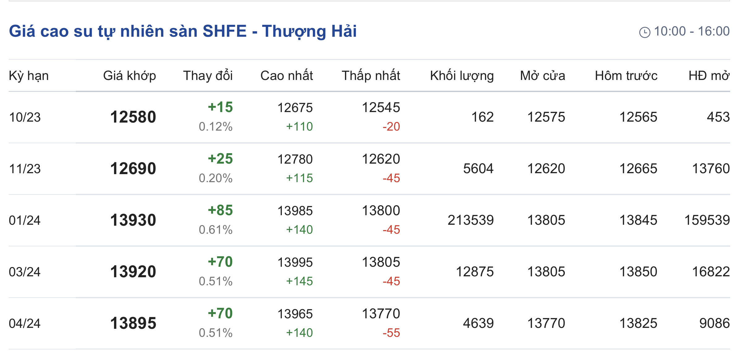 Trên Sàn giao dịch hàng hóa tương lai Thượng Hải (SHFE), giá cao su RSS3 giao kỳ hạn tháng 10/2023 được điều chỉnh lên mức 12.580 nhân dân tệ/tấn, tăng 0,12% (tương đương 15 nhân dân tệ) so với giao dịch trước đó.