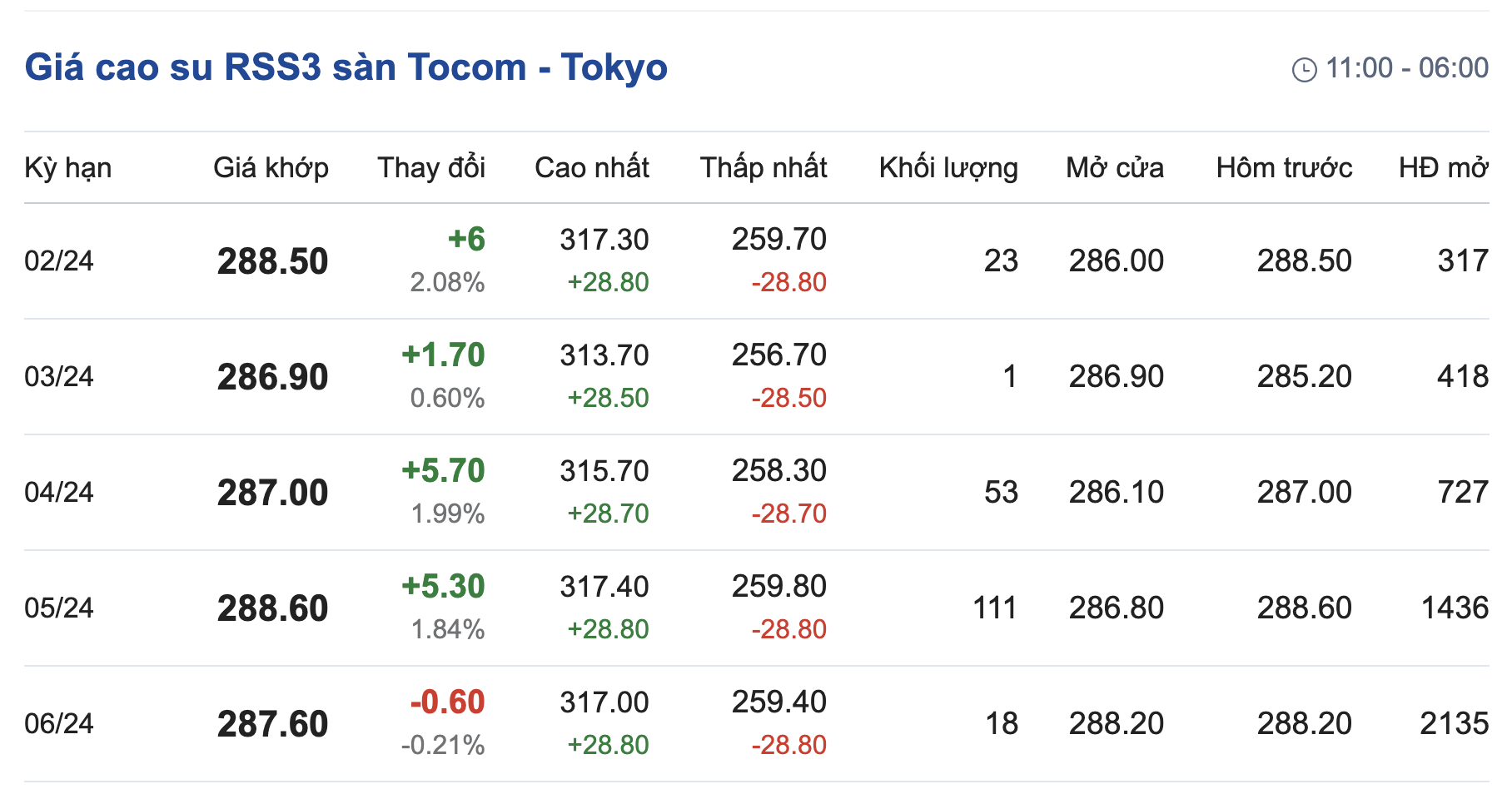 Tại Sở giao dịch hàng hóa Tokyo (TOCOM), giá cao su kỳ hạn giao tháng 2/2024 đạt mức 288,5 yen/kg, tăng 2,08% (tương đương 6 yen/kg) tại thời điểm khảo sát vào lúc 7h12 (giờ Việt Nam).