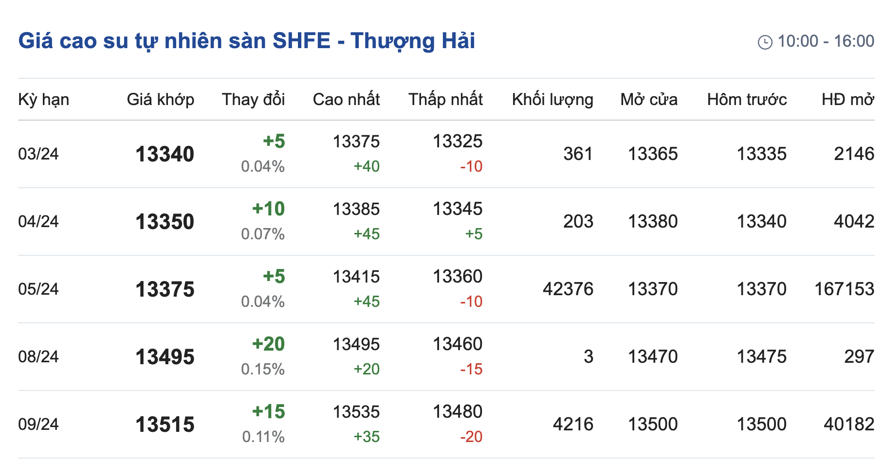 Trên Sàn giao dịch hàng hóa tương lai Thượng Hải (SHFE), giá cao su RSS3 giao kỳ hạn tháng 3/2024 được điều chỉnh lên mức 13.340 nhân dân tệ/tấn, tăng 0,04% (tương đương 5 nhân dân tệ) so với giao dịch.