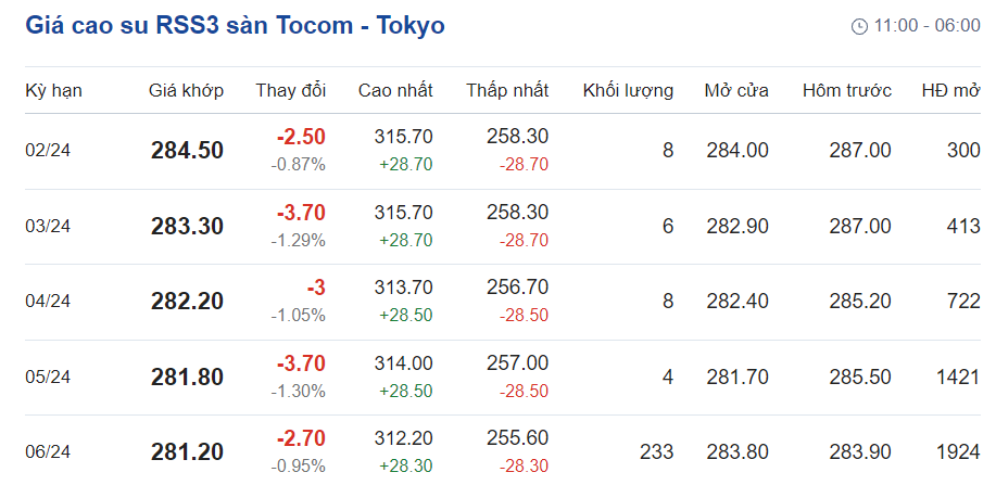 Tại Sở giao dịch hàng hóa Tokyo (TOCOM), giá cao su kỳ hạn giao tháng 2/2024 đạt mức 284,5 yen/kg, giảm 0,87% (tương đương 2,5 yen/kg) tại thời điểm khảo sát vào lúc 6h00 (giờ Việt Nam).