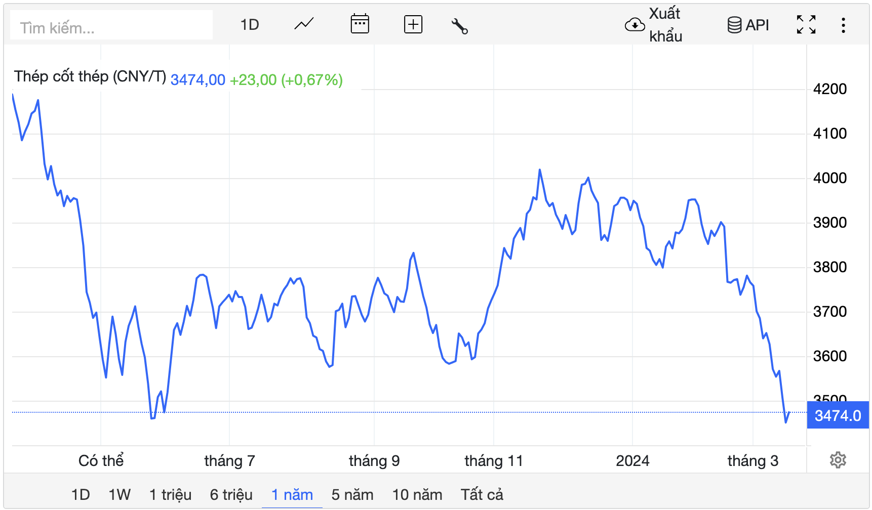 Giá thép giao tháng 5/2024 trên Sàn giao dịch Thượng Hải được điều chỉnh lên mức 3.474 nhân dân tệ/tấn, tăng 0,67% (tương đương tăng 23 nhân dân tệ/tấn). Khảo sát tại thời điểm 7h10 ngày 15/3 (theo giờ Việt Nam).