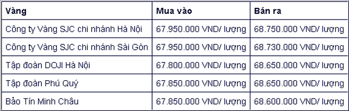 Trong khi đó, Công ty Vàng bạc đá quý Sài Gòn SJC niêm yết, giá vàng mua vào 67,95 triệu đồng/lượng; giá bán ra là 68,75 triệu đồng/lượng. Chênh lệch giá mua - bán vàng SJC đang là 800.000 đồng/lượng.
