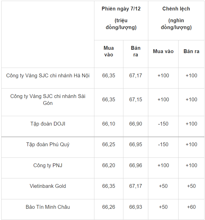 Tại thời điểm khảo sát lúc 5h30 ngày 7/12, trên sàn giao dịch của Công ty Vàng bạc đá quý Sài Gòn SJC, vàng SJC đang là 66,35 triệu đồng/lượng mua vào và 67,17 triệu đồng/lượng bán ra.