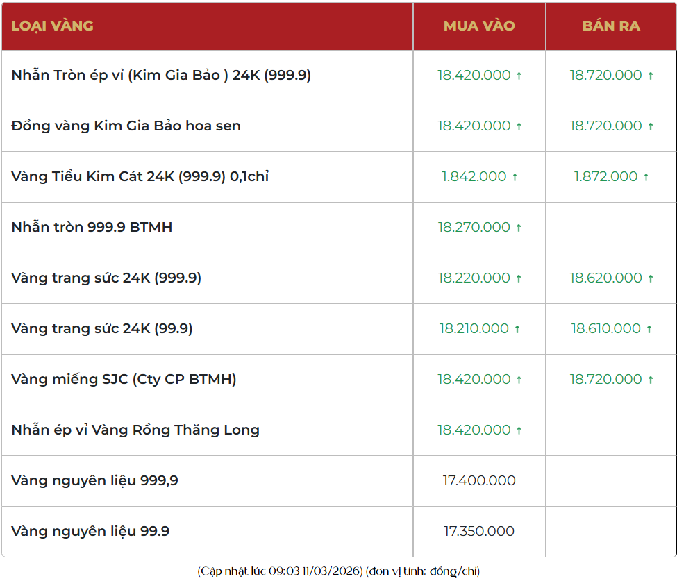 Ghi nhận vào khoảng 9h, giá vàng miếng tại các hệ thống lớn như SJC, PNJ và DOJI được niêm yết phổ biến ở mức 184,2 – 187,2 triệu đồng/lượng (mua vào – bán ra), tăng khoảng 1,1 triệu đồng/lượng ở cả hai chiều so với mức đóng cửa hôm qua.