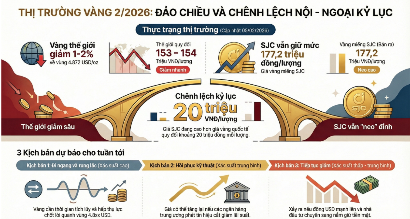 Đối với thị trường trong nước, biến số quan trọng nhất không chỉ là giá quốc tế, mà còn là mức chênh lệch nội – ngoại. Khi SJC đang ở vùng 174–177 triệu đồng/lượng, trong khi giá thế giới quy đổi quanh 153–154 triệu đồng/lượng, giá vàng trong nước có thể tiếp tục giữ mặt bằng cao ngay cả khi thế giới biến động giảm.