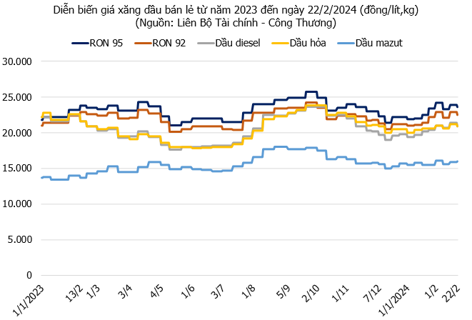Tại một diễn biến khác mô hình dự báo giá xăng dầu ứng dụng Machine Learning của Viện Dầu khí Việt Nam (VPI) cho thấy, tại kỳ điều hành ngày hôm nay 29/2/2024, giá xăng bán lẻ được dự báo tăng nhẹ 0,7 - 0,9%, tương ứng tăng khoảng 151 - 210 đồng, đưa giá xăng E5 RON92 lên mức 22.621 đồng/lít và giá xăng RON 95 lên mức 23.800 đồng/lít.