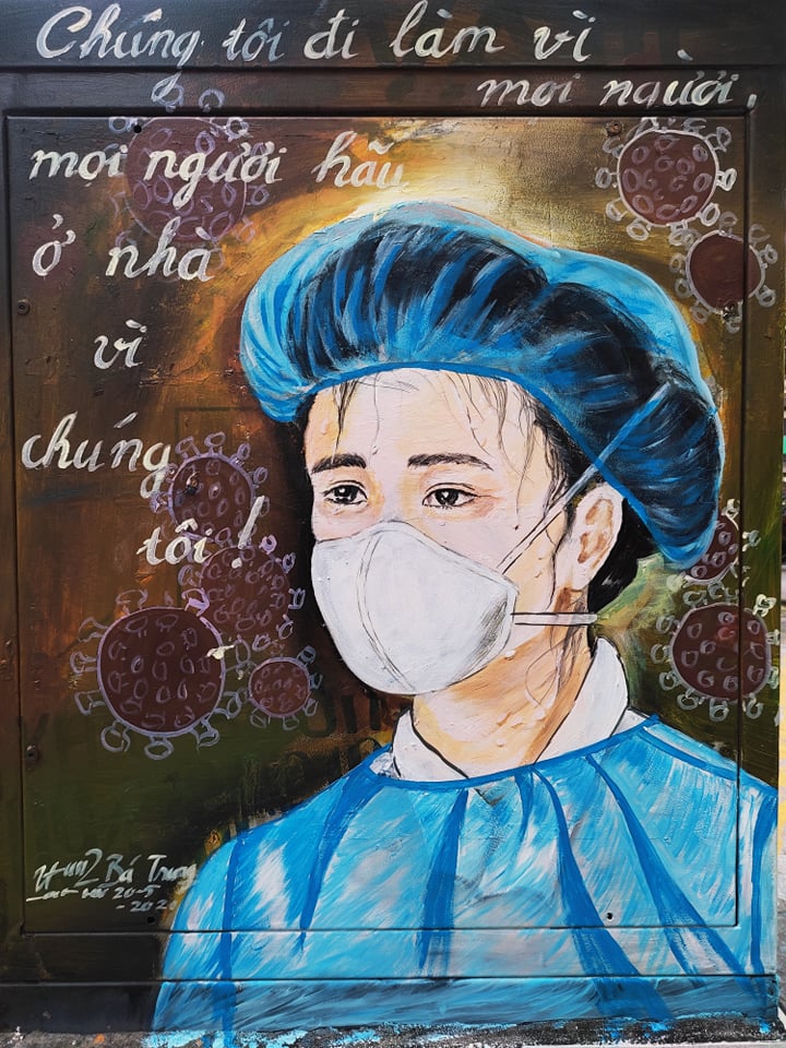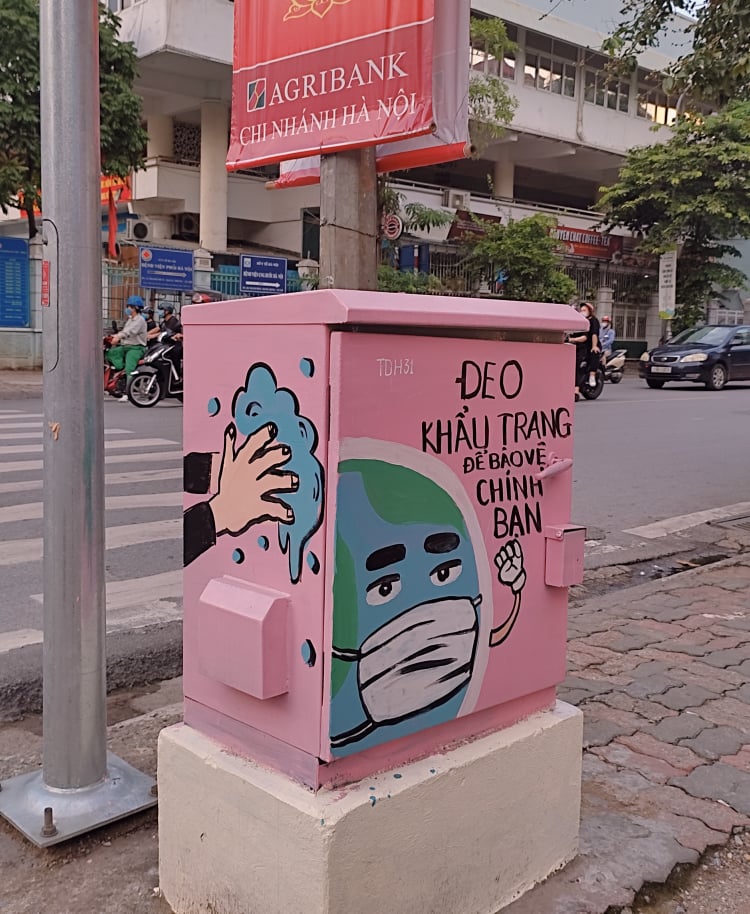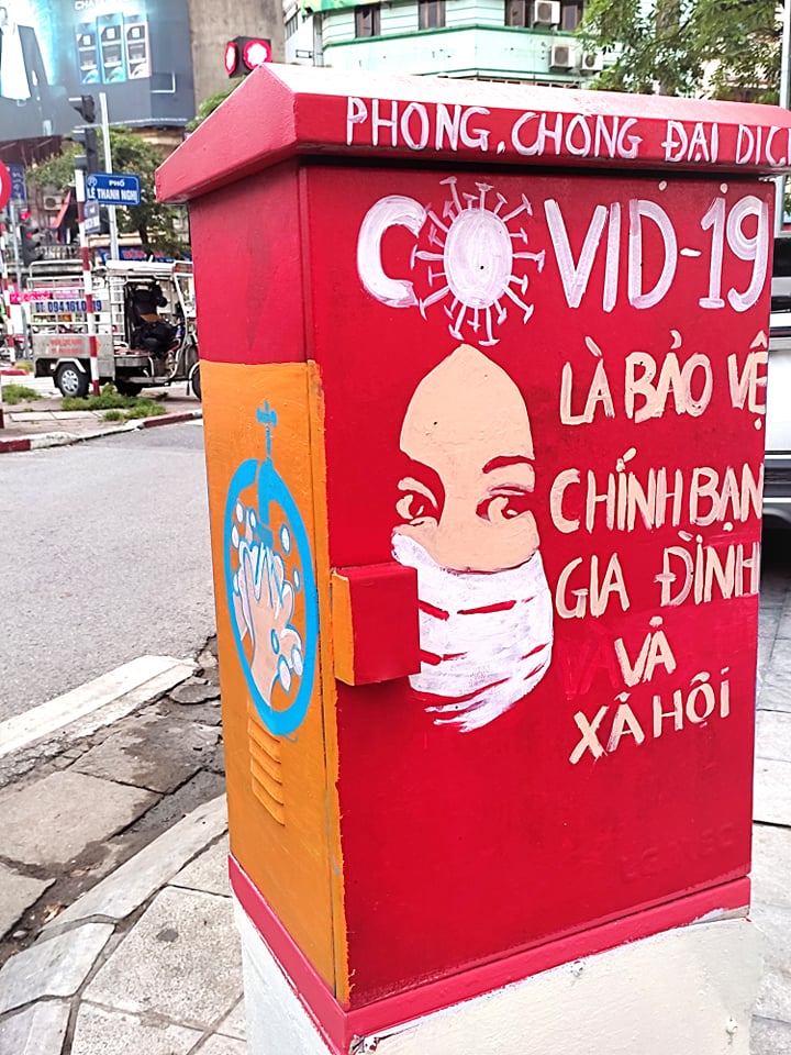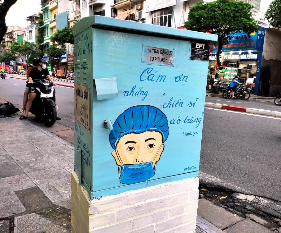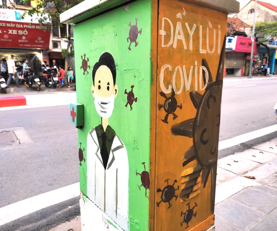 Nhằm tuyên truyền và nâng cao tinh thần phòng chống dịch của người dân thủ đô, Hội Cựu chiến binh kết hợp với Đoàn Thanh niên Bách Khoa đã vẽ các bức tranh cổ động về đội ngũ y, bác sĩ; công tác phòng chống dịch trên nhiều bốt điện tại ngã tư Bạch Mai - Lê Thanh Nghị (quận Hai Bà Trưng, Hà Nội).