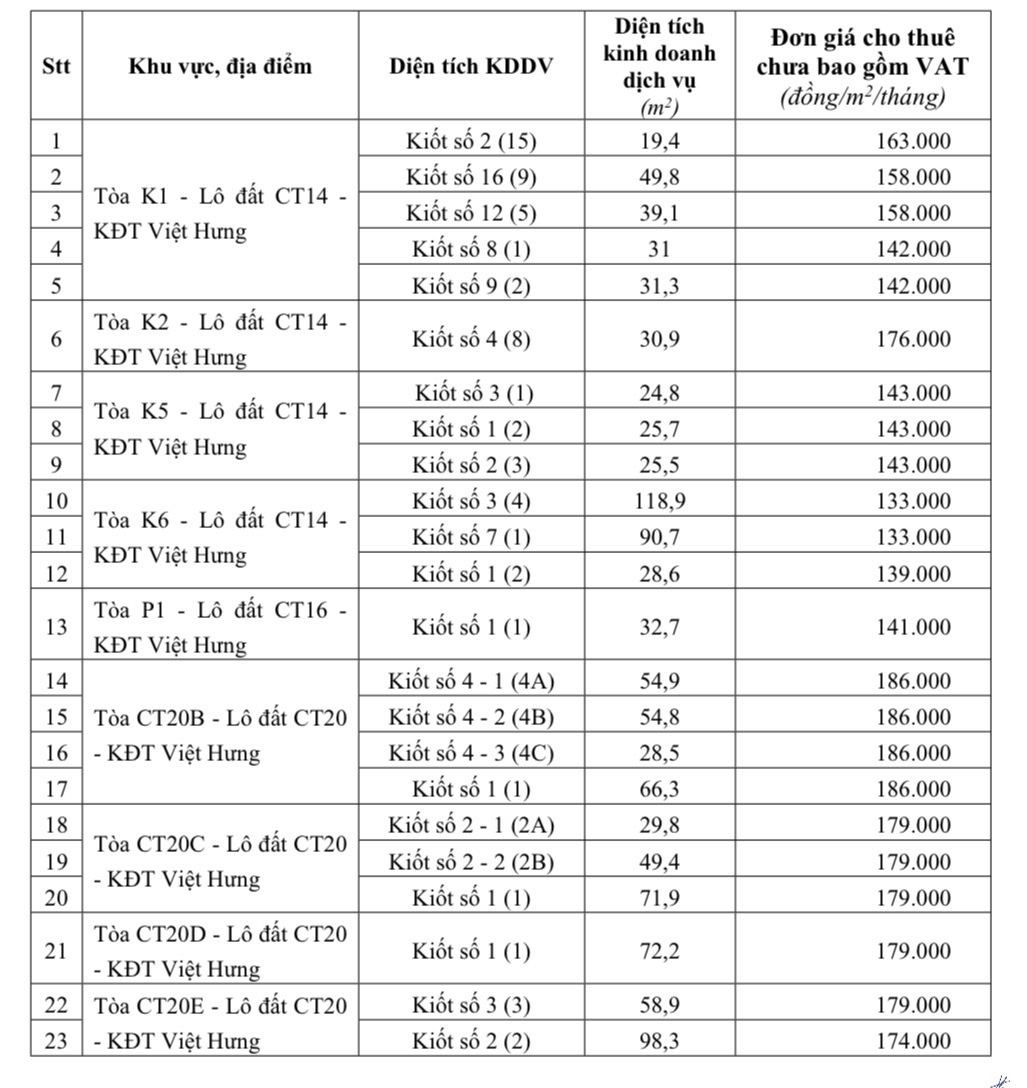 Cụ thể, Thành phố phê duyệt đơn giá cho thuê diện tích kinh doanh dịch vụ 9 tòa nhà chung cư thương mại tại Khu đô thị Việt Hưng thuộc tài sản công của Thành phố gồm: Tòa K1 - Lô đất CT14; Tòa K2 - Lô đất CT14; Tòa K5 - Lô đất CT14; Tòa K6 - Lô đất CT14; Tòa P1 - Lô đất CT16; Tòa CT20B - Lô đất CT20; Tòa CT20C - Lô đất CT20; Tòa CT20D - Lô đất CT20; Tòa CT20E - Lô đất CT20.