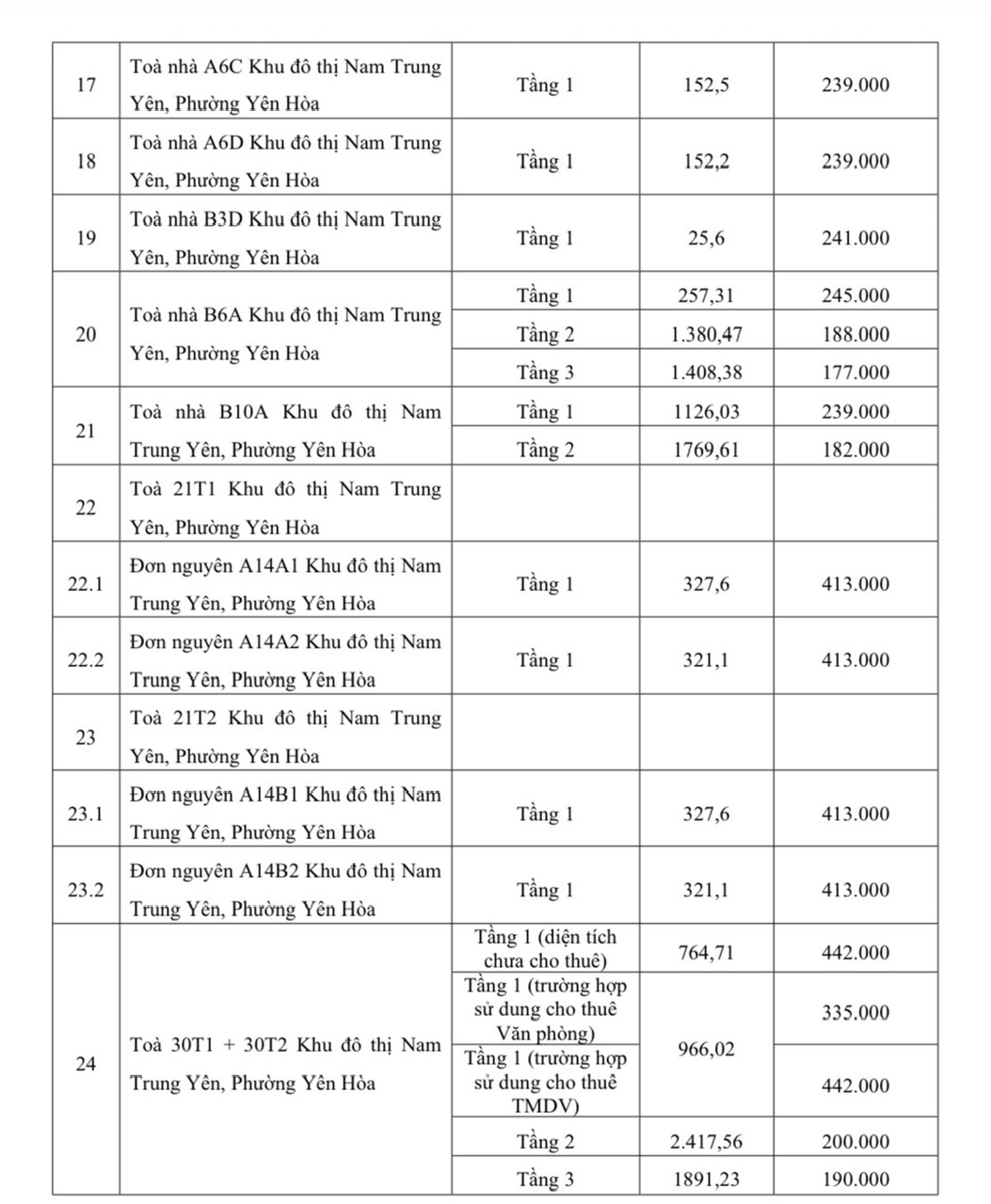 Đồng thời cũng phê duyệt đơn giá cho thuê diện tích kinh doanh dịch vụ tại 24 tòa chung cư tái định cư thuộc tài sản công của Thành phố giao cho Trung tâm Quản lý nhà Thành phố Hà Nội quản lý, gồm: Tòa nhà N01 và N02 Tây Nam ĐHTM đường Lê Đức Thọ, phường Từ Liêm; Tòa nhà CTI.1-1A và CTI.1-1B, CTI.2 Khu nhà ở Vĩnh Hoàng, phường Tương Mai; Tòa nhà CT2 Khu tái định cư tại ao Hoàng Cầu, phường Ô Chợ Dừa; Tòa nhà Lô E Khu đô thị Yên Hòa, phường Yên Hòa; Tòa nhà N07 Khu 5.3ha, phường Cầu Giấy.