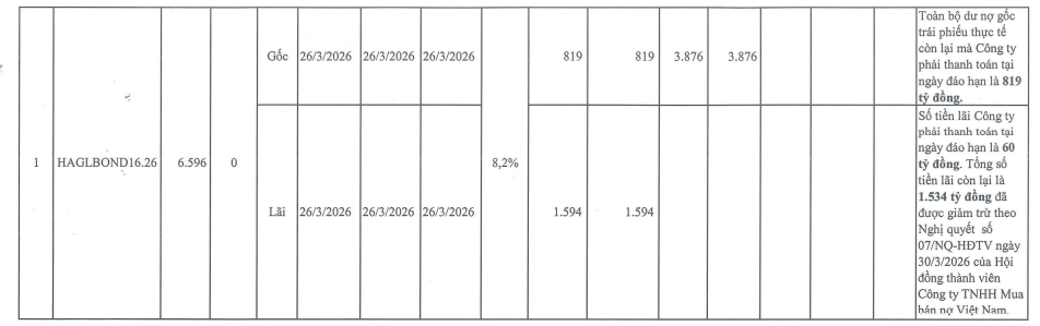 Ngày 31/3/2026, CTCP Hoàng Anh Gia Lai (HAGL, mã HAG) công bố thông tin về tình hình thanh toán gốc và lãi trái phiếu 2016, mã trái phiếu HAGLBOND16.26. Theo đó, tại ngày đáo hạn 26/3/2026, doanh nghiệp phải thanh toán 819 tỷ đồng tiền nợ gốc và 1.594 tỷ đồng tiền lãi của lô trái phiếu trên. Công ty đã trả hết số nợ gốc và đưa dư nợ gốc của lô trái phiếu về 0.