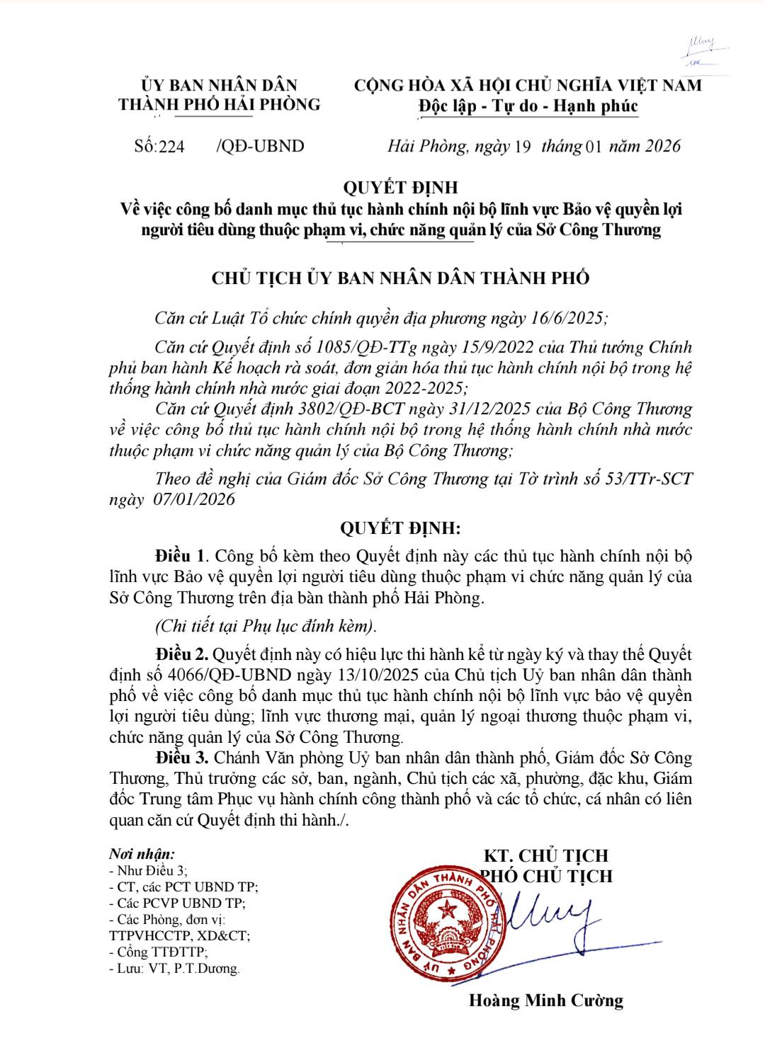Ngày 19/01/2026, Ủy ban nhân dân thành phố Hải Phòng ban hành Quyết định số 224/QĐ-UBND về việc công bố Danh mục thủ tục hành chính nội bộ trong lĩnh vực bảo vệ quyền lợi người tiêu dùng, thuộc phạm vi, chức năng quản lý của Sở Công Thương.