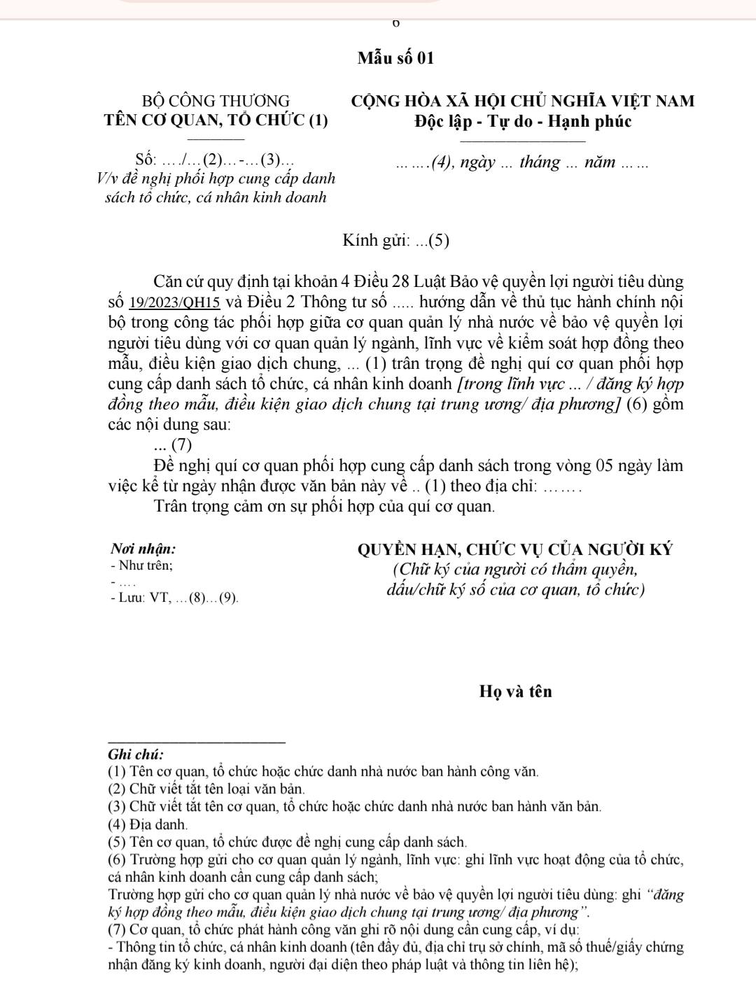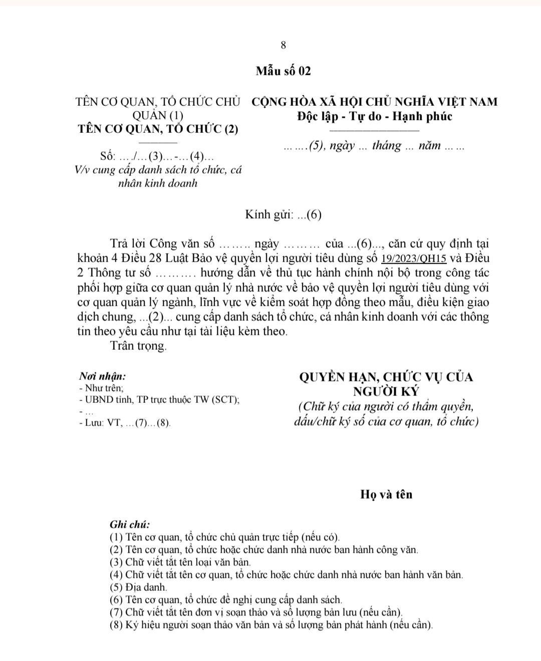 Thủ tục hành chính nội bộ thứ hai được công bố là cung cấp danh sách tổ chức, cá nhân kinh doanh áp dụng hợp đồng theo mẫu, điều kiện giao dịch chung trong giao dịch với người tiêu dùng. Đây là thủ tục có ý nghĩa quan trọng trong việc xây dựng và cập nhật thông tin phục vụ công tác quản lý nhà nước, giúp cơ quan quản lý nắm bắt đầy đủ tình hình áp dụng hợp đồng theo mẫu trên thị trường.