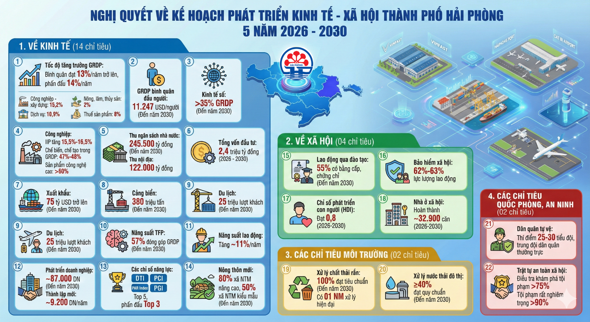 Bước sang giai đoạn 2026-2030, Hải Phòng "không lòng vòng", không che giấu tham vọng trở thành một thành phố cảng biển tầm cỡ khu vực Đông Nam Á, với 22 mục tiêu rõ ràng, điển hình như: Xác định chỉ tiêu tăng trưởng GRDP bình quân giai đoạn này đạt từ 13% đến 14%/năm, với GRDP bình quân đầu người đến năm 2030 đạt 11.247 USD; Đặc biệt, chỉ tiêu kinh tế số đóng góp trên 35% vào GRDP là một lời khẳng định về việc lấy công nghệ làm động lực chính cho sự phát triển.