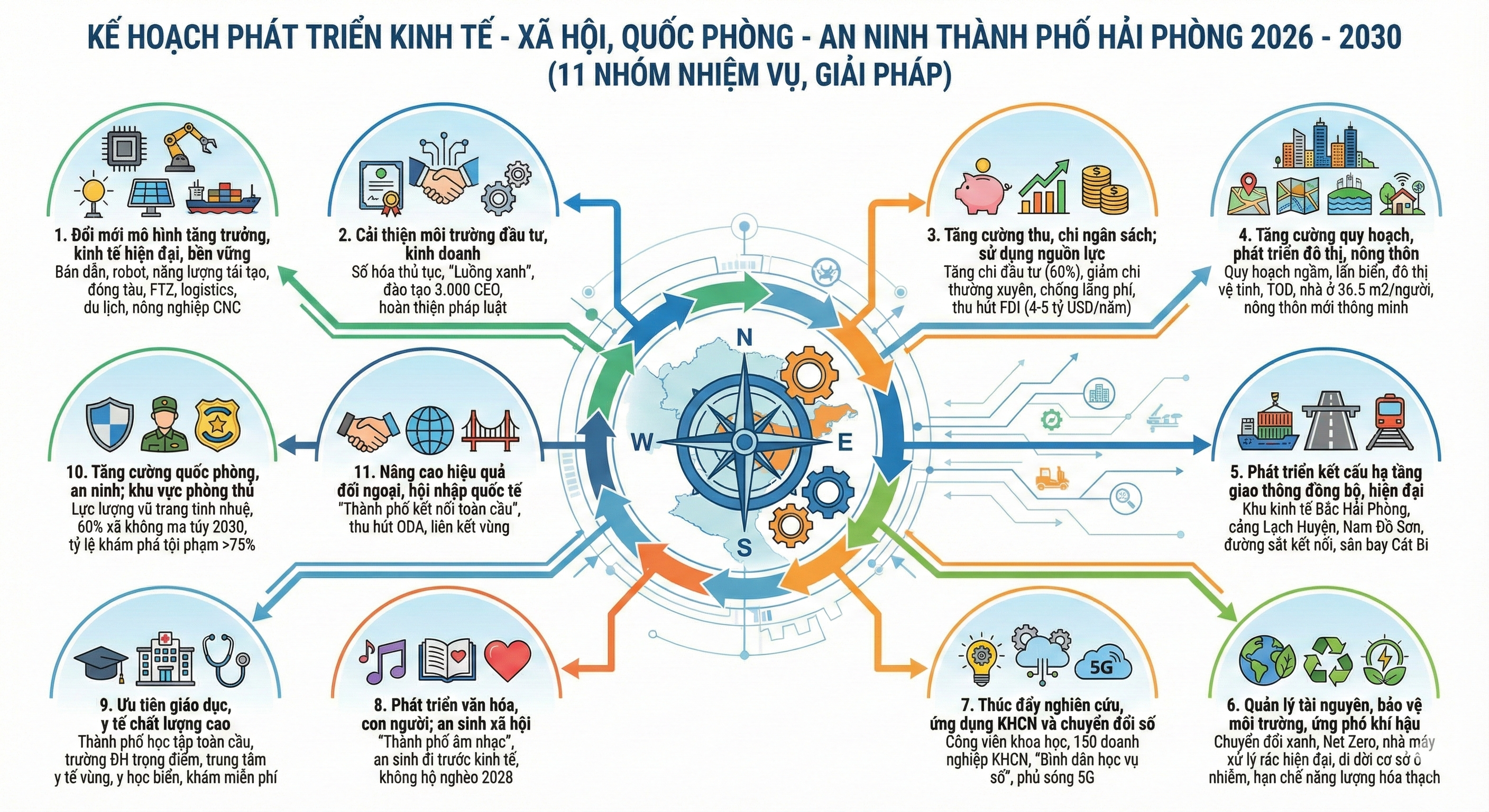 Ngoài ra, Hải Phòng không chỉ muốn tăng trưởng về lượng mà còn muốn dẫn đầu về chất, thông qua việc duy trì vị trí trong Top 3 đến Top 5 cả nước về các chỉ số năng lực cạnh tranh (PCI), cải cách hành chính (PAR Index) và chuyển đổi xanh (PGI).