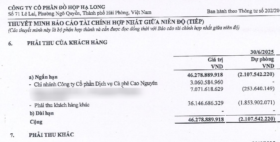 Cụ thể, thông qua Báo cáo tài chính hợp nhất bán niên năm 2025 công bố ngày 30/8/2025 của Đồ hộp Hạ Long, CTCP Dịch vụ Cà phê Cao Nguyên (công ty sở hữu chuỗi cà phê Highlans Coffee) được xác định là một trong những khách hàng lớn. Tại mục Thuyết minh báo cáo tài chính hợp nhất giữa niên độ, về khoản phải thu ngắn hạn khách hàng, doanh nghiệp này ghi nhận khoản công nợ hơn 3 tỷ đồng với Highlands Coffee.