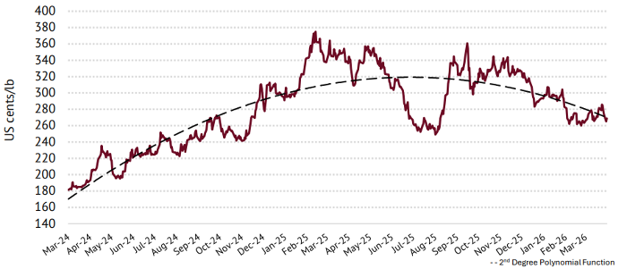 Từ ngày 14 đến 24/3, giá cà phê phục hồi trở lại và dao động ổn định trong khoảng 269–271 US cent/pound. Thị trường phản ứng với các tín hiệu trái chiều khi hoạt động vận tải qua eo biển Hormuz dần được nối lại, nhưng nguồn cung ngắn hạn vẫn có dấu hiệu thắt chặt, thể hiện qua cấu trúc giá kỳ hạn.