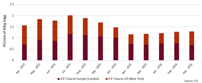 Trên các sàn giao dịch, giá robusta tại London giảm 2,5% xuống 161,9 US cent/pound, trong khi arabica tại New York tăng nhẹ 0,5% lên 290,2 US cent/pound. Điều này khiến chênh lệch giá giữa hai thị trường tiếp tục nới rộng thêm 4,5%, đạt 128,3 US cent/pound trong tháng 3/2026.