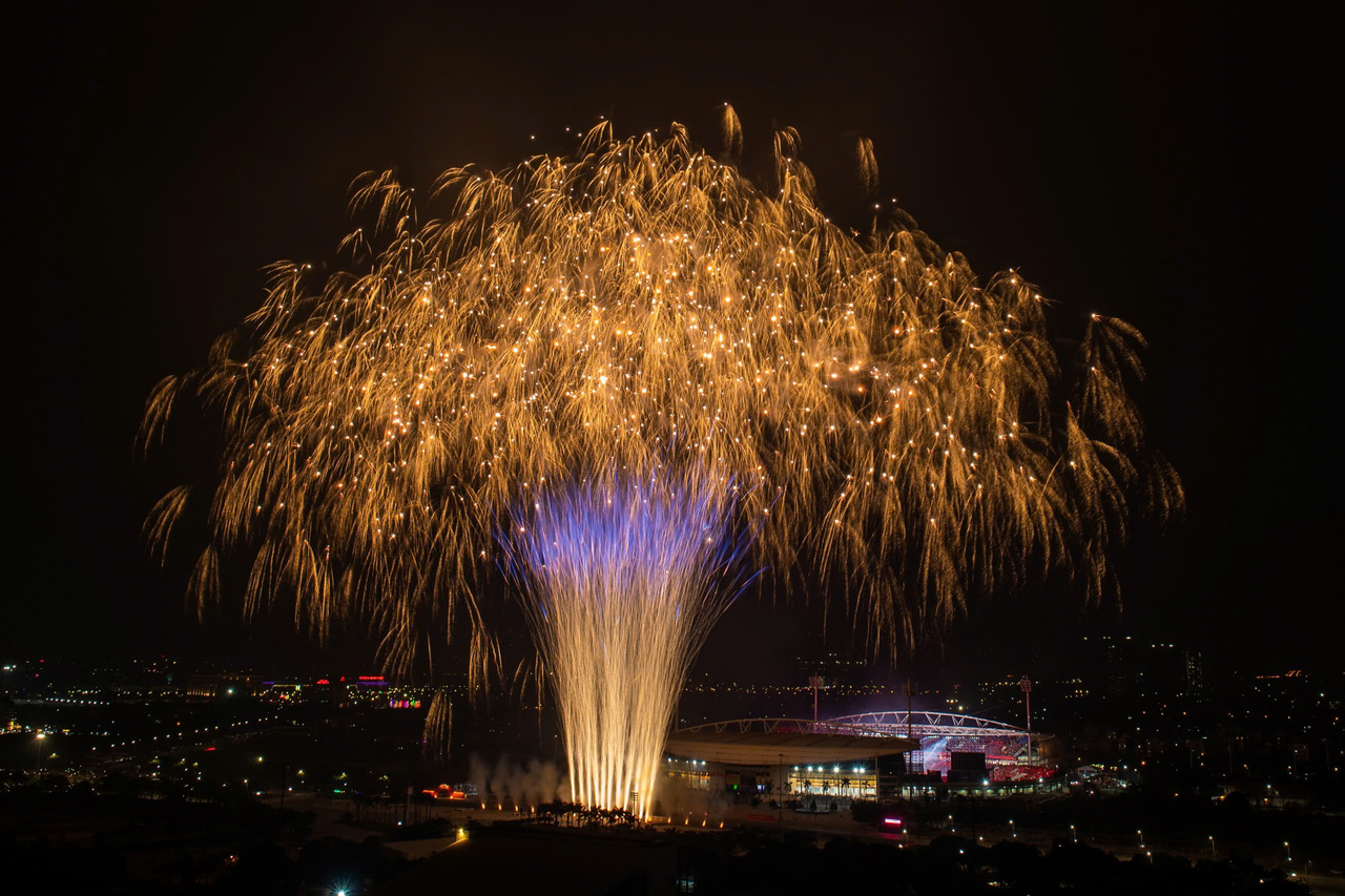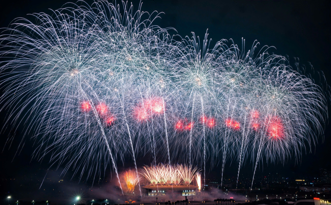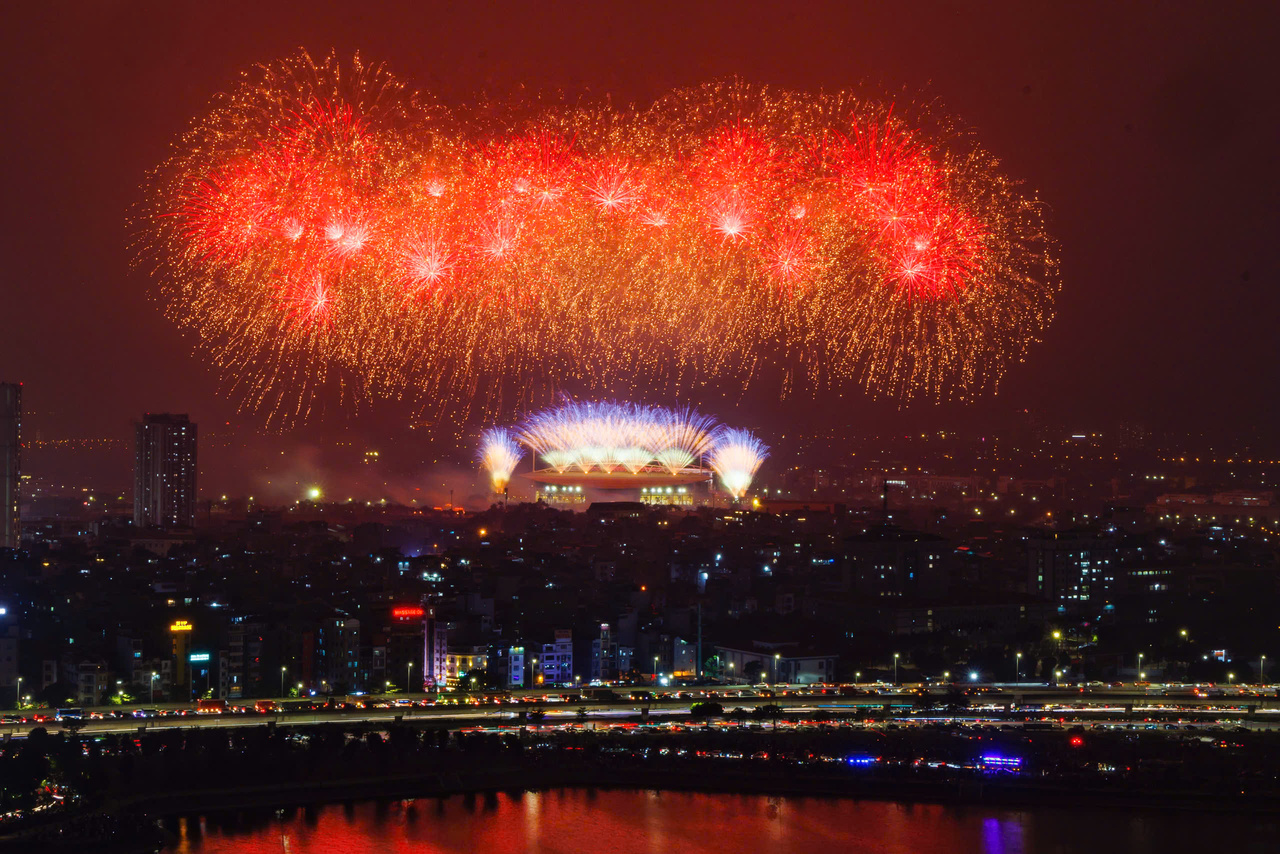 Ở những cao trào của chương trình, hàng nghìn quả pháo hoa tầm cao đồng loạt khai hỏa, kết hợp hệ thống giàn phun hỏa thuật trên mái và hai cánh khán đài, đẩy cảm xúc khán giả lên đỉnh điểm.