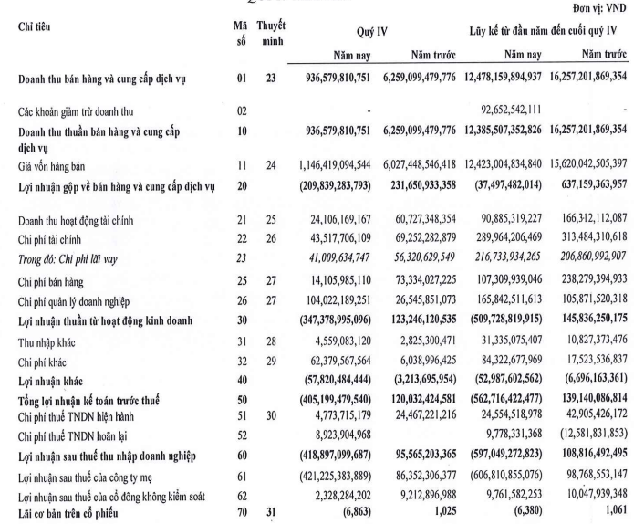 Lũy kế cả năm 2025, Việt Phát ghi nhận lỗ ròng gần 607 tỷ đồng trong năm 2025, đánh dấu năm đầu tiên thua lỗ kể từ khi công bố số liệu tài chính. Trong khi đó, doanh thu thuần đạt hơn 12.385 tỷ đồng, giảm 24% so với năm trước.