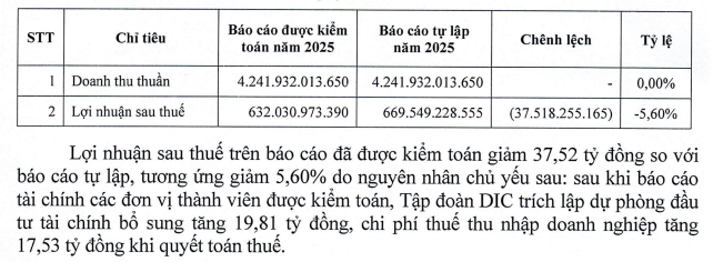 Báo cáo tài chính kiểm toán năm 2025 cho thấy các chỉ tiêu hợp nhất của DIC Corp hầu như không có biến động đáng kể so với báo cáo tự lập trước đó. Doanh thu thuần hợp nhất được điều chỉnh nhẹ xuống 4.718 tỷ đồng, giảm khoảng 9 tỷ đồng, trong khi lợi nhuận sau thuế hợp nhất cũng chỉ giảm khoảng 1 tỷ đồng, còn 646 tỷ đồng.