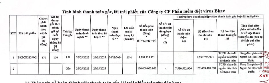 Tuy nhiên, đến thời điểm đáo hạn, doanh nghiệp vẫn không hoàn thành nghĩa vụ thanh toán. Theo công bố gần nhất, tính đến ngày 26/08/2025, Bkav Pro còn nợ gần 162,5 tỷ đồng tiền gốc và khoảng 9 tỷ đồng tiền lãi. Lô trái phiếu này cũng đã bị hủy đăng ký giao dịch trên HNX do đã đến hạn thanh toán nhưng chưa được tất toán.