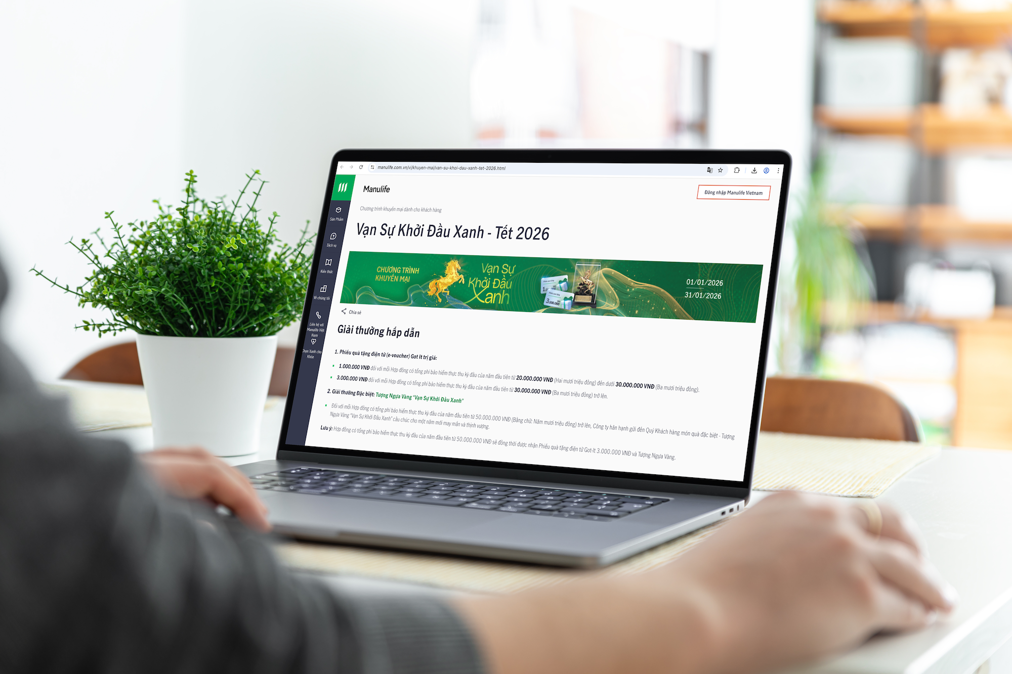 Chương trình khuyến mại “Vạn Sự Khởi Đầu Xanh – Tết 2026” được áp dụng cho khách hàng cá nhân tham gia bảo hiểm qua kênh phân phối đại lý. Để xem thông tin chi tiết về thể lệ chương trình, khách hàng truy cập website www.manulife.com.vn, liên hệ tổng đài 1900 1776 hoặc thông qua kênh tư vấn trực tuyến Live Chat trên ứng dụng Manulife Vietnam.
