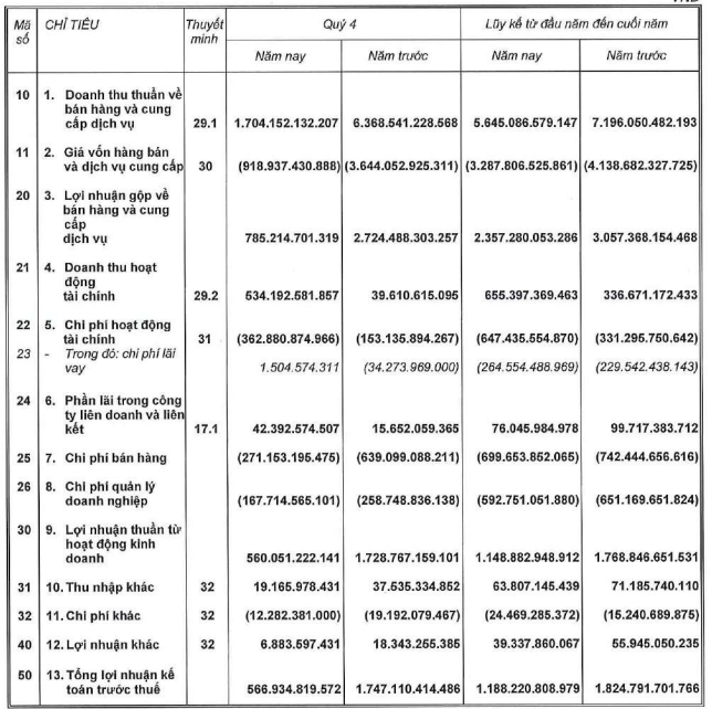 Doanh nghiệp cho biết nguyên nhân chủ yếu do trong năm 2025, lượng bàn giao tại các dự án trọng điểm, đặc biệt là Akari, giảm mạnh so với cùng kỳ. Trong cơ cấu doanh thu quý 4, mảng bán nhà ở và căn hộ tiếp tục chiếm tỷ trọng áp đảo, khoảng 95% tổng doanh thu.