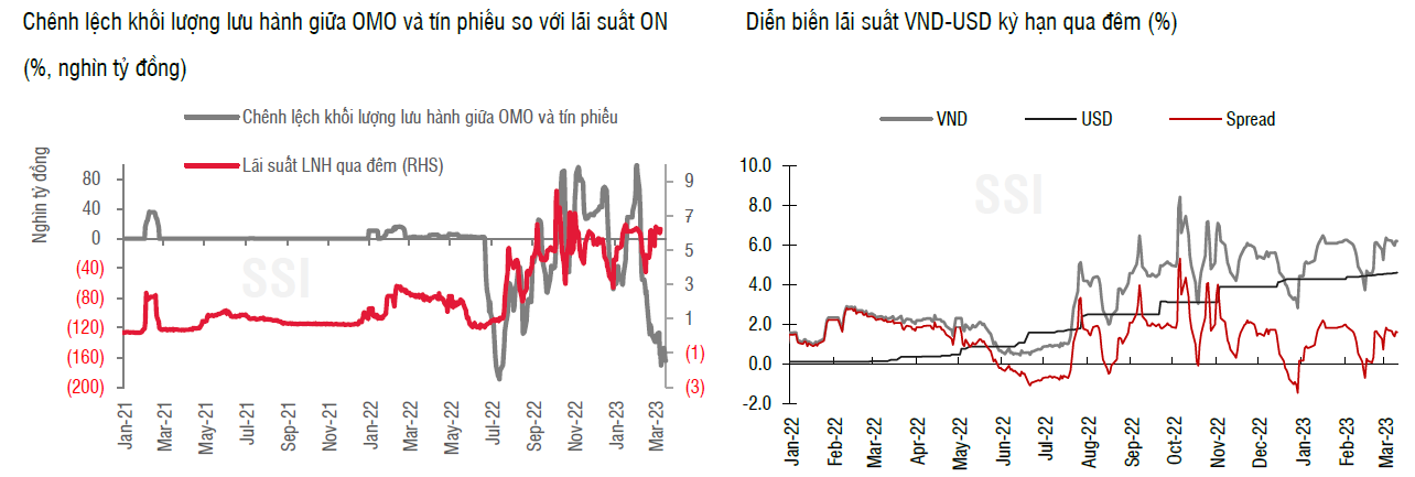 Theo Bản tin thị trường tiền tệ, trái phiếu của Chứng khoán SSI, tuần qua, nghiệp vụ bán tín phiếu được NHNN đẩy mạnh, với việc phát hành 108.8 nghìn tỷ đồng ở 2 kỳ hạn 7 và 91 ngày và lãi suất 6%. Bên cạnh đó, kênh cầm cố vẫn được duy trì xuyên suốt tuần, nhằm tài trợ cho khối lượng đáo hạn tương đối lớn (gần 25 nghìn tỷ đồng, bao gồm việc đáo hạn từ các hợp đồng 91 ngày được phát hành vào tháng 12/2022).