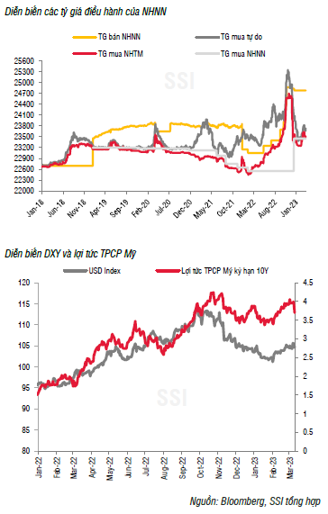 Kết tuần, tỷ giá niêm yết từ Vietcombank giảm 50 đồng/USD, trong khi tỷ giá chợ đen đi ngang. Tỷ giá trên thị trường liên ngân hàng giảm 0,15%, xuống VND 23,700/USD. Diễn biến tỷ giá trong nước tiếp tục hạ nhiệt trong phiên ngày 13.3 sau những thông tin về SVB được công bố.