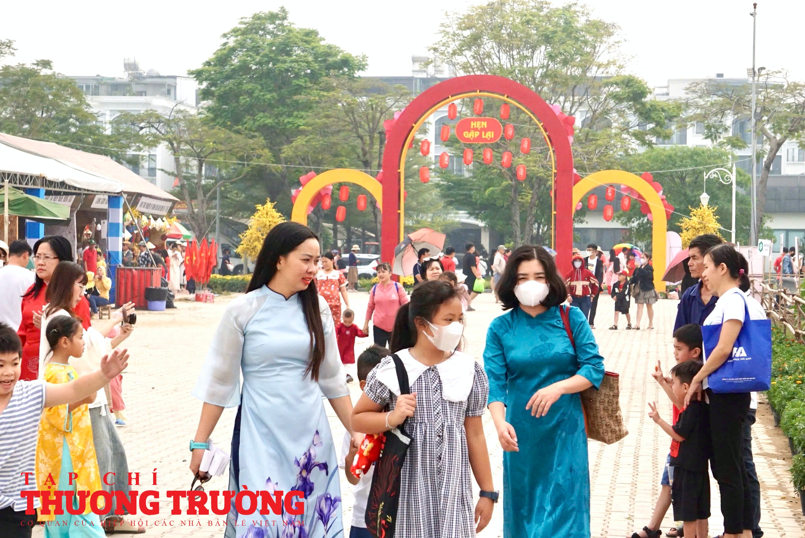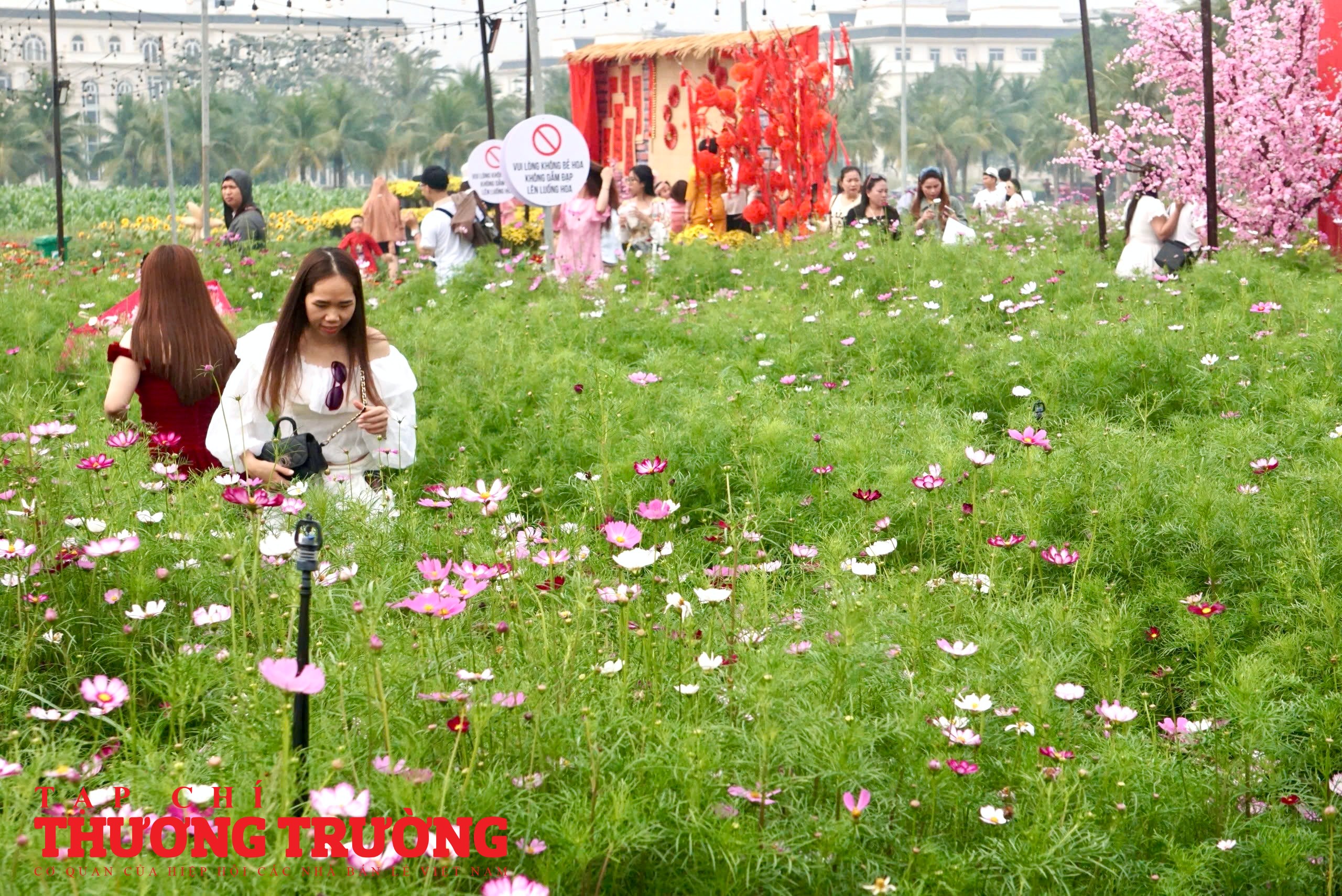Ghi nhận của PV ngày 13/1, khu đất rộng hơn 2 ha trong khu đô thị Vạn Phúc đã được chủ đầu tư đầu tư bài bản, bố trí thành không gian lễ hội hoa Tết với nhiều tiểu cảnh, đường hoa và khu trải nghiệm văn hóa. Không gian rực rỡ sắc màu khiến nhiều người thích thú, rủ nhau “lên đồ” áo dài, váy Tết để check-in từ sáng sớm đến chiều tối.