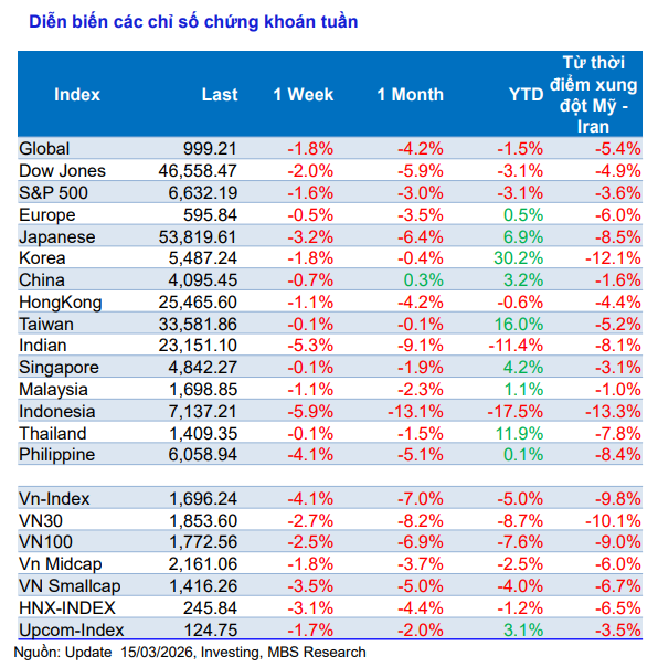 Báo cáo chiến lược thị trường tuần của Chứng khoán MBS cho biết chứng khoán toàn cầu đồng loạt giảm điểm trong bối cảnh xung đột tại Trung Đông leo thang, làm gia tăng lo ngại về lạm phát, chuỗi cung ứng và chính sách tiền tệ.
