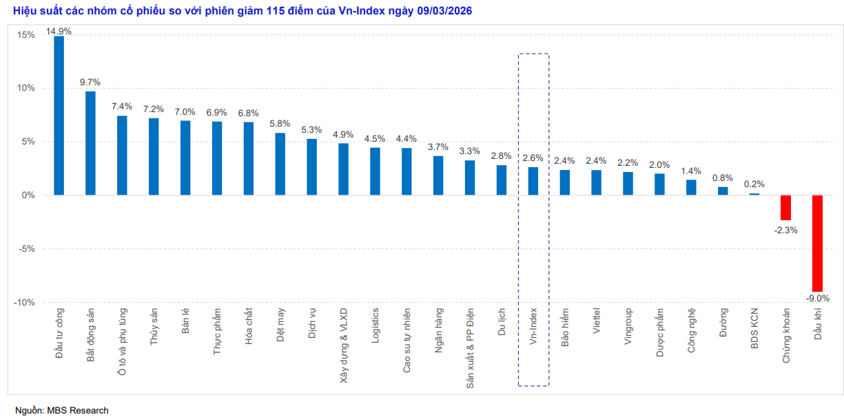 MBS cho rằng thị trường có thể tiếp tục rung lắc để kiểm định lại vùng hỗ trợ này. Tuy nhiên, thay vì giảm đồng loạt như giai đoạn trước, cổ phiếu có xu hướng phân hóa mạnh hơn giữa các nhóm ngành.