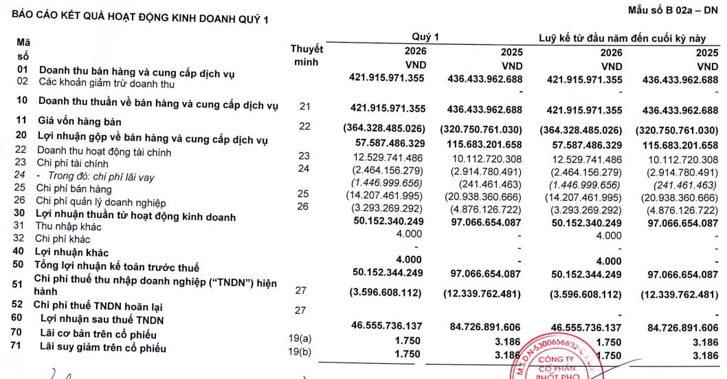 Theo báo cáo tài chính quý 1/2026, CTCP Phốt pho Apatit Việt Nam ghi nhận doanh thu đạt khoảng 422 tỷ đồng, giảm nhẹ 3% so với cùng kỳ năm trước. Tuy nhiên, giá vốn hàng bán tăng mạnh khoảng 14% do chi phí nguyên vật liệu đầu vào leo thang, khiến lợi nhuận gộp giảm một nửa xuống còn khoảng 58 tỷ đồng.