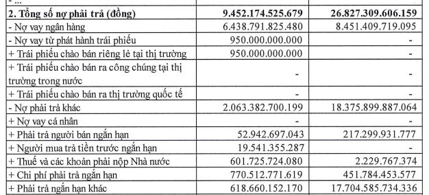 Tuy nhiên, tổng nợ phải trả lại tăng đột biến lên gần 26.800 tỷ đồng, gấp gần 3 lần so với cuối năm trước. Điều này khiến hệ số nợ phải trả/vốn chủ sở hữu tăng mạnh từ 1,54 lần lên 3,29 lần. Xét về cơ cấu, nợ vay ngân hàng tăng lên hơn 8.400 tỷ đồng, trong khi khoản “nợ phải trả khác” chiếm tỷ trọng lớn nhất, lên tới hơn 18.300 tỷ đồng.