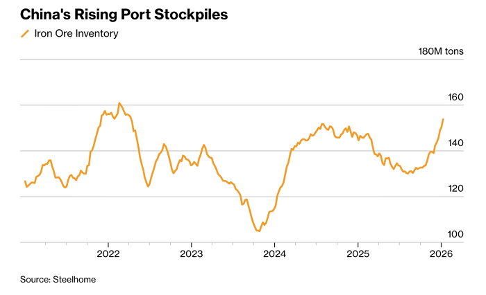 Cùng với đó, tồn kho quặng sắt tại các cảng Trung Quốc đã tăng mạnh, tiến sát mức cao nhất trong bốn năm. Diễn biến này cho thấy áp lực dư cung vẫn hiện hữu, trong khi các nhà hoạch định chính sách tiếp tục nhấn mạnh cải cách cơ cấu, cắt giảm công suất dư thừa thay vì thúc đẩy tăng trưởng nóng của ngành thép.