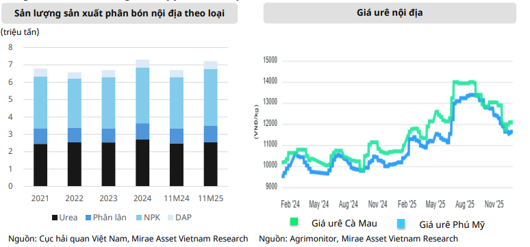 Năm 2025 ghi nhận bức tranh tương đối tích cực của ngành phân bón Việt Nam, khi sản lượng sản xuất nội địa duy trì đà tăng trưởng bất chấp nhu cầu trong nước suy yếu theo chu kỳ và môi trường thị trường toàn cầu nhiều biến động. Theo Agrimonitor và Mirae Asset Vietnam Research, tổng sản lượng phân bón sản xuất trong nước lũy kế 11 tháng năm 2025 đạt khoảng 7,22 triệu tấn, tăng 8% so với cùng kỳ.