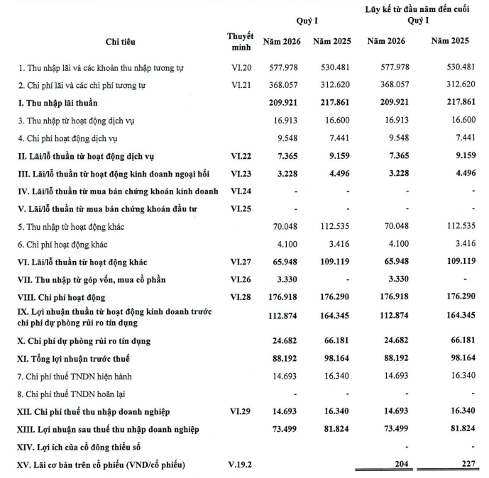 Về nhân sự, số lượng cán bộ nhân viên cuối quý I của ngân hàng là 1.519 người, giảm 0,6% so với cuối năm 2025. Thu nhập bình quân của nhân viên cũng giảm từ 29 triệu đồng/người/tháng xuống 24 triệu đồng/người/tháng.