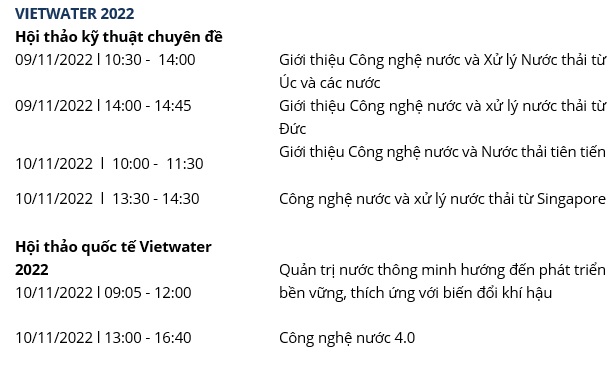 Đặc biệt trong năm nay, lần đầu tiên triển lãm Vietwater 2022 sẽ được đồng tổ chức cùng triển lãm Propak tại SECC- Trung tâm hội chợ và triển lãm Sài Gòn. Triển lãm Vietwater diễn ra từ ngày 09 -11/11/2022 quy tụ đông đảo doanh nghiệp trong và ngoài nước tham gia trưng bày. Vietwater 2022 sẽ đem đến rất nhiều sản phẩm, công nghệ và giải pháp quan trọng hàng đầu của ngành Cấp thoát nước, Công nghệ lọc nước và Xử lý nước thải tại Việt nam bao gồm Quản lý tài nguyên nước, Công nghệ quản lý cấp nước, xử lý nước thải đô thị và công nghiệp, Công nghệ tưới tiêu và thoát nước, Bơm, Van, Ống, Phụ kiện ngành nước, công nghệ xử lý bùn thải, Công nghệ khử muối, Công nghệ xanh và quản lý nước bền vững, Công nghệ xử lý nước và tái sử dụng nước từ nước thải và nước mưa, Hệ thống đo lường, giám sát chất lượng nước thông minh, …cùng rất nhiều các sản phẩm và dịch vụ liên quan phục vụ ngành nước tại Việt Nam.