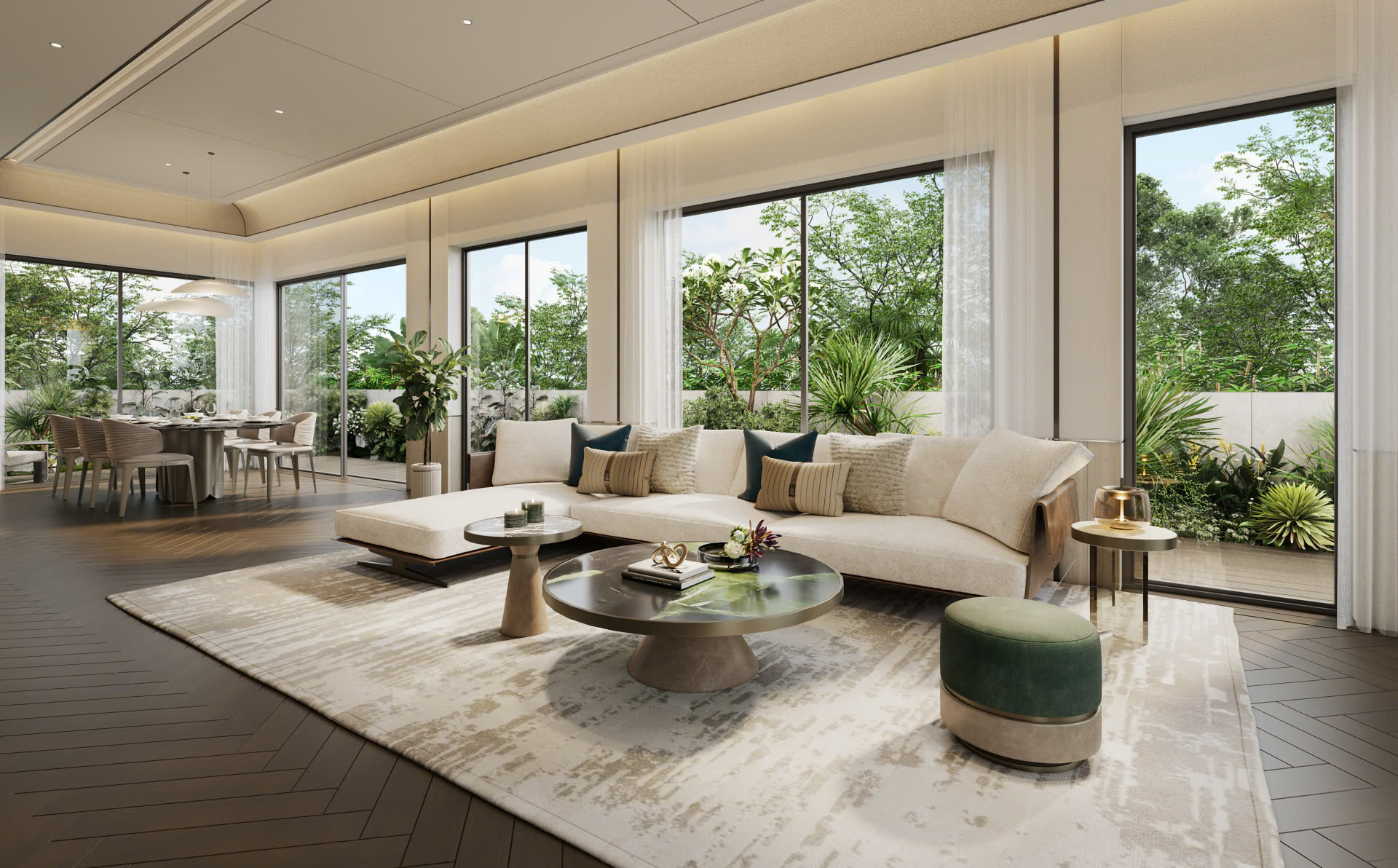 Hai nửa song lập hiện lên như hai nốt đồng điệu trong cùng một hòa âm, với mặt đứng tinh giản mà vững chải, gợi dáng biệt thự đơn lập nhưng không phô trương. Bên trong, hệ cửa rộng được bố trí mạch lạc để đón trọn ánh sáng tự nhiên và mở tầm nhìn ra mảng xanh bao quanh. Cấu trúc “mở” hiếm có còn cho phép hợp nhất hai căn thành một dinh thự liền khối, vừa đảm bảo sự riêng tư cần thiết, vừa mở ra nhiều không gian linh hoạt cho sinh hoạt gia đình, điều hiếm có giữa trung tâm đô thị.